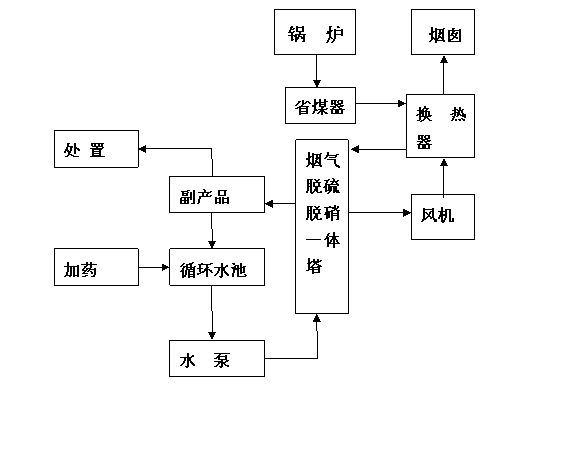 本方案設計流程:煙氣→余熱回收裝置(省煤器)→換熱器→除塵器→脫硝脫硫一體塔→換熱器→排放。(本流程僅供參考,我公司根據不同情況設計不同方案,但均以處理達標、投資小、占地面積小、管理方便為宗旨)